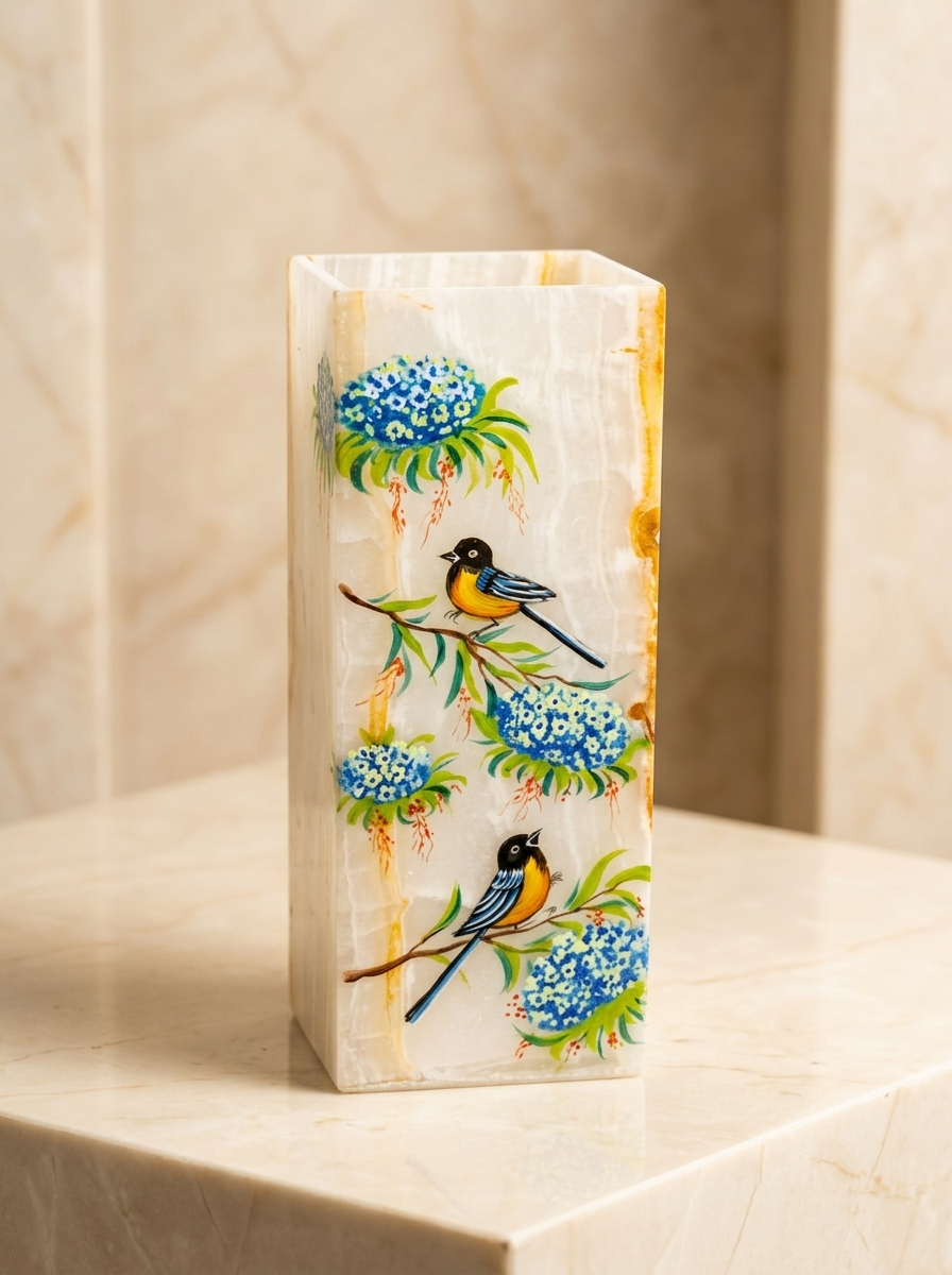 گلدان رومیزی مرمر با نگارگری گل و مرغ(مکعبی)