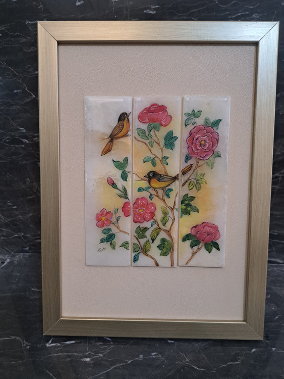 نقاشی گل و مرغ اصیل: اجرای هنرمندانهی طرحهای سنتی گل و مرغ با ریزهکاریهای خیرهکننده و رنگهای طبیعی.